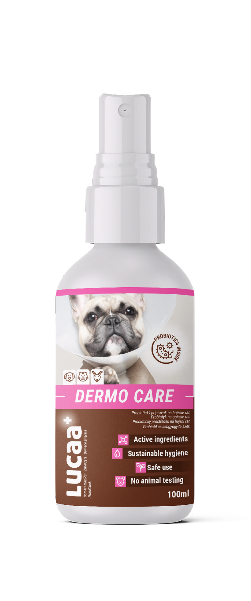 LUCAA+ Dermo Care je probiotický sprej, který podporuje rychlejší a bezpečnější hojení ran u domácích mazlíčků. Díky jedinečné kombinaci prospěšných bakterií obnovuje mikrobiální rovnováhu, odstraňuje organické nečistoty a chrání před infekcemi včetně rezistentních bakterií MRSA